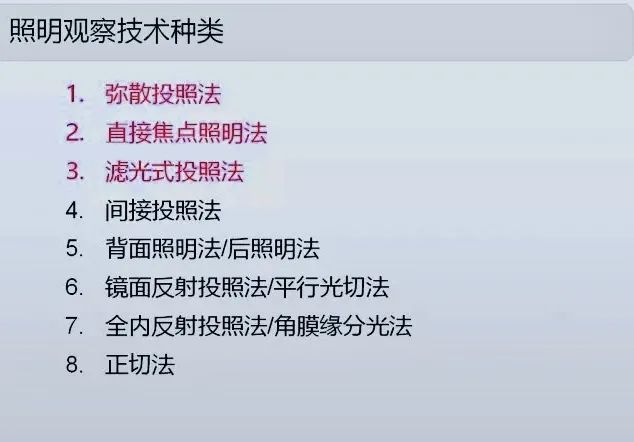 直接焦點照明法是最常用的檢查方法,檢查時把光的焦點調節至與顯微鏡的焦點完全合。也就是說,要把你重點關注的部分照亮同時放大了看。