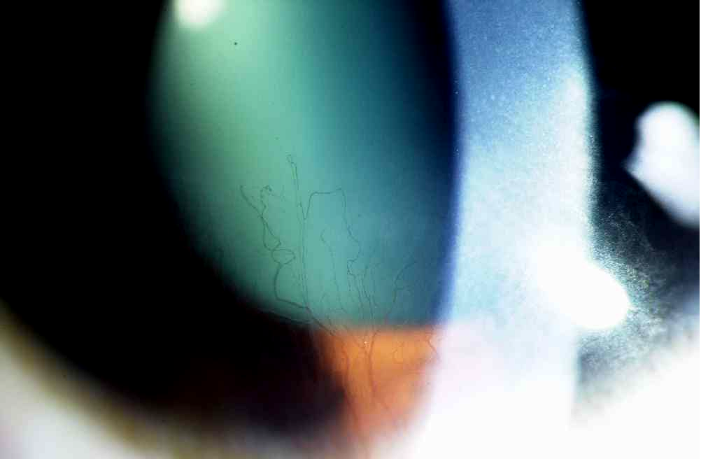 對于典型的圓錐角膜,常規裂隙直接焦點照明法和彌散光照明法只能看到角膜變薄和Munson征,如果觀察仔細可能勉強觀察到Fleischer環。但在鈷藍光照明下,即使不需要熒光素染色,Fleischer環也非常容易觀察到。