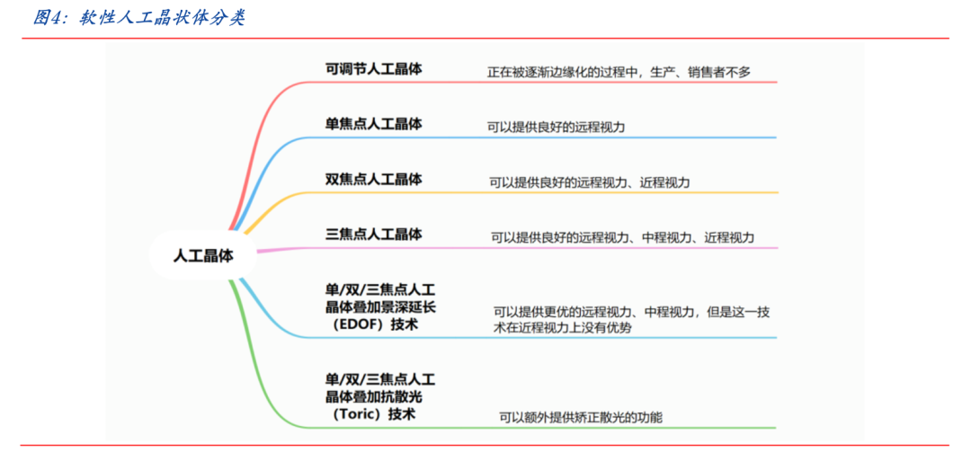 軟性人工晶狀體具有眾多細分領域。軟性人工晶狀體細分領域包括可調節人工晶狀體、單焦點人工晶狀體、雙焦點人工晶狀體、三焦點人工晶狀體、人工晶狀體疊加景深延長(EDOF,即ExtendDepthofField)技術、人工晶狀體疊加抗散光(Toric)技術等。其中,三焦點人工晶狀體價格較高,附加抗散光功能的三焦點人工晶狀體價格更高。
