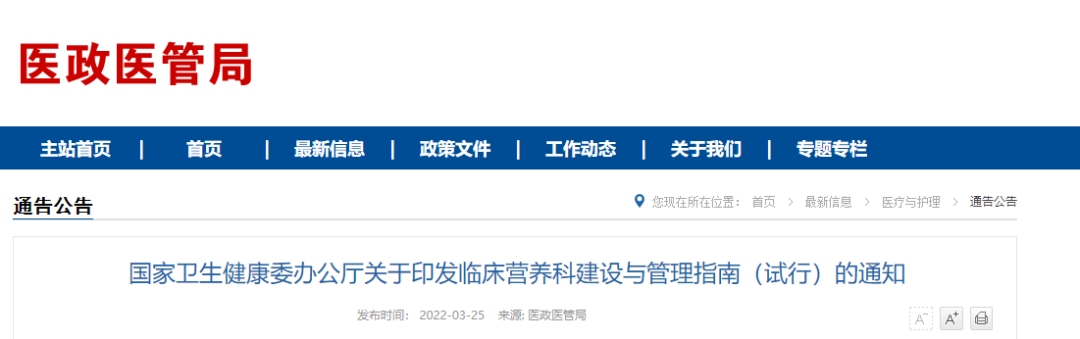 今年3月,國家衛生健康委為指導和規范醫療機構臨床營養科建設與管理,組織起草了《臨床營養科建設與管理指南(試行)》,指南要求:所有二級以上綜合醫院以及腫瘤、兒童、精神等專科醫院,全部新增一個科室——臨床營養科。