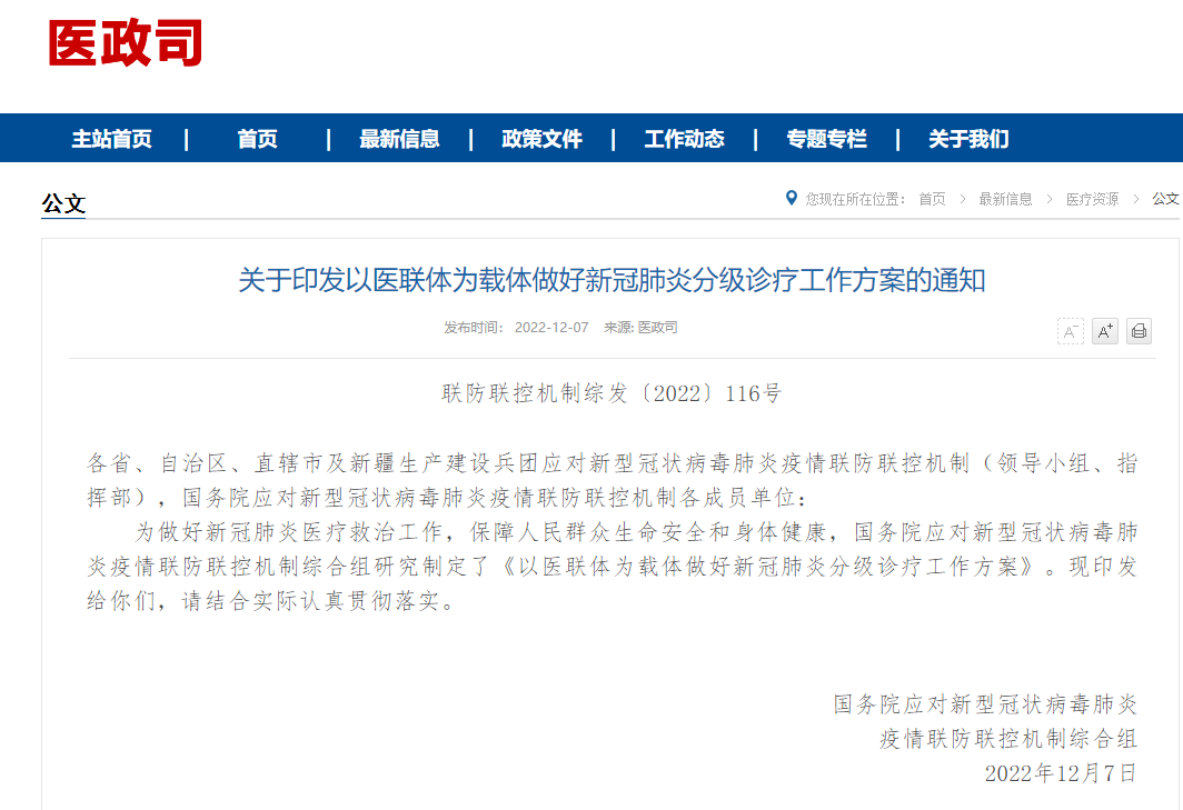 在經歷抗原檢測試劑盒需求猛增,一盒難求后,12月7日,國家衛健委發布《關于印發醫聯體為載體做好新冠肺炎分級診療工作方案的通知》。