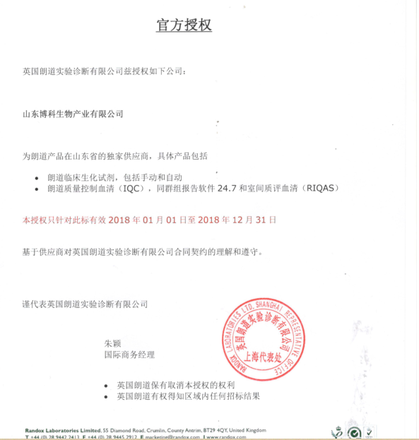 熱烈祝賀博科生物續簽英國朗道山東獨家代理熱烈祝賀博科生物續簽英國朗道山東獨家代理2017年度,博科生物與RANDOX 朗道的合作,取得了非常好的成績。2017年是朗道在中國區改革的第一年,在此過程中憑借朗道優質的產品質量和博科生物優秀的業務及售后團隊,博科生物緊跟國內形勢…