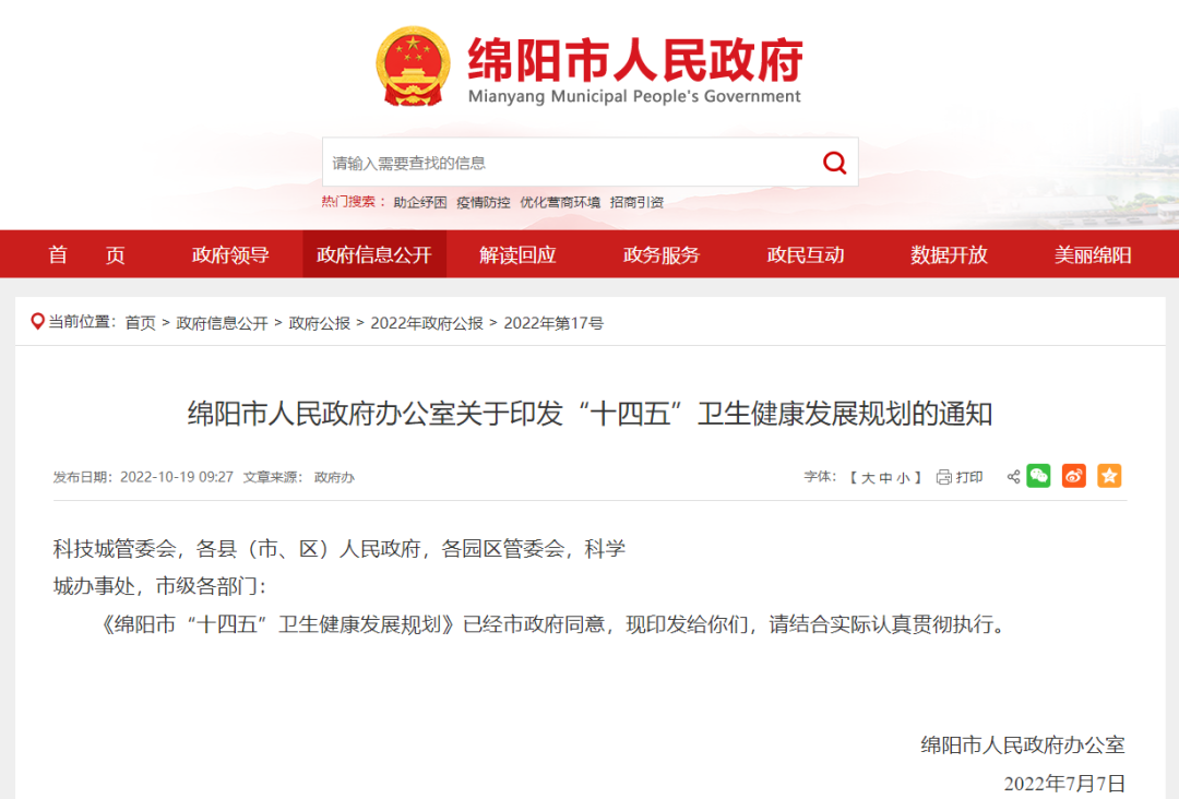 “十四五”時期是綿陽加快建設中國科技城和社會主義現代化綿陽的關鍵時期。為深入推進健康綿陽建設,不斷提高人民健康水平,根據《綿陽市國民經濟和社會發展第十四個五年規劃和二〇三五年遠景目標綱要》《四川省“十四五”衛生健康發展規劃》《“健康綿陽2030”規劃綱要》,制…